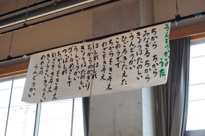 体育館で赤組、白組に分かれて、運動会で歌う歌の練習をしました。