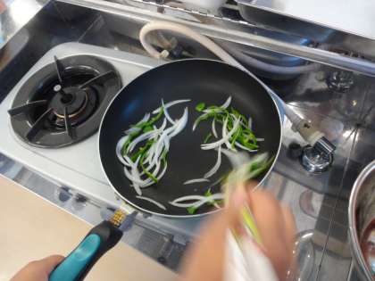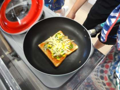 忙しい朝にも簡単に作ることのできる「ピザトースト」の調理を行いました。「こげないように火加減を調節した」「ピーマンと玉ねぎを同じ厚さで切ることで火の通り具合が同じになった」などとそれぞれが考え、工夫して調理ができました。家庭での朝食作りに生かしていけたらと思います。