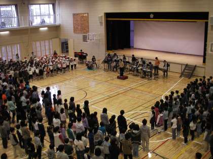 体育館に全校児童が並んでもまだまだ余裕があります。気持ちよく、思いっきり歌えます。
