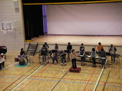 今日24日は新しい体育館での初めての音楽朝会です。音楽委員の子どもたちは朝早くから楽器の準備をしていました。
