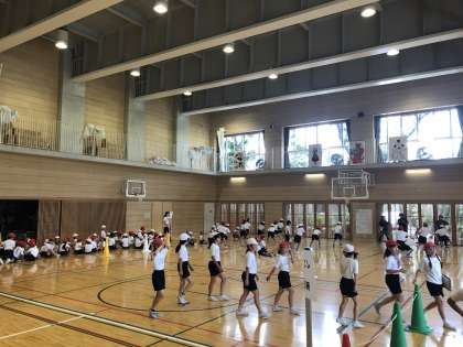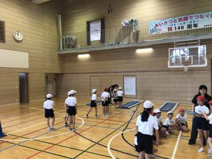 初めての1年生には6年生が、2年生には5年生がサポートについてくれました。特に6年生は、1年生に「ボールを投げる時は…」や「跳ぶときは…」などとアドバイスをしながらサポートしてくれました。とても頼もしかったです。