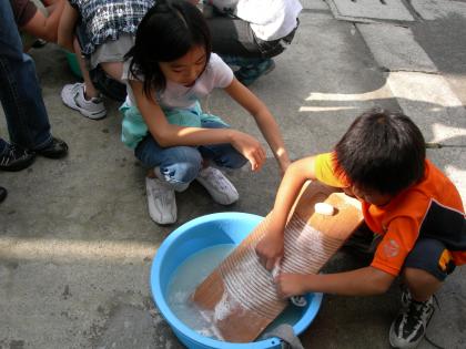 社会の「昔さがしをしよう」の学習で、洗濯板を使って自分のくつ下を洗いました。見るのと違って、実際に自分の手で洗ってみるといろんなことが分かりました。「この姿勢で長時間洗うのはつらそう・・・。」「汚れを落ちやすくするために、でこぼこにして工夫したんだね」「冬は水が冷たいから大変だよね。」