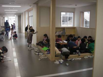 新校舎の各階に絨毯敷きのコーナーがあります。昼休みに2階に行ってみますと子どもたちでコーナーは満員です。本を読む子、ゲームをしている子、寝ころぶ子、様々です。