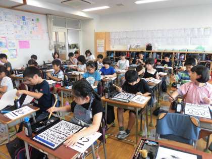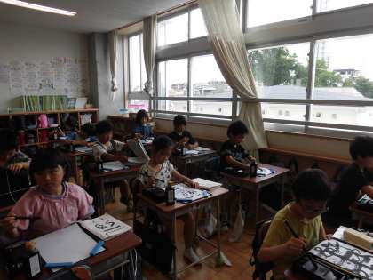 待ちに待った、習字の学習が始まりました。初回は、正しい用具の使い方や筆の持ち方、姿勢などを丁寧に学習しました。太い線、細い線、まっすぐな線、曲がった線など様々な線を毛筆で書きました。また、鳥獣戯画を小筆で描いたクラスもありました。これからの学習が楽しみになった様子でした。