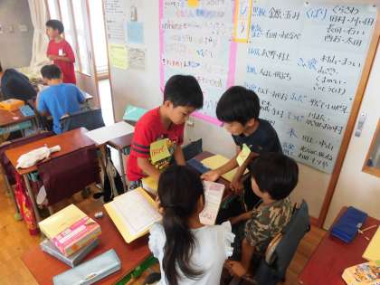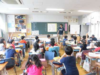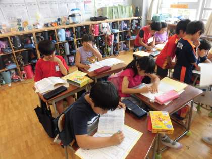 3年生は自分が努力や工夫をしてうまくいった経験を思い出して作文にまとめています。経験したことを付箋やワークシートに書いて文章の構成が決まりました。次は清書をするのですが、その前に国語辞典を使って添削をしました。辞典を使い慣れている子が「こどもアドバイザー」になって友達にやさしく教えてくれました。