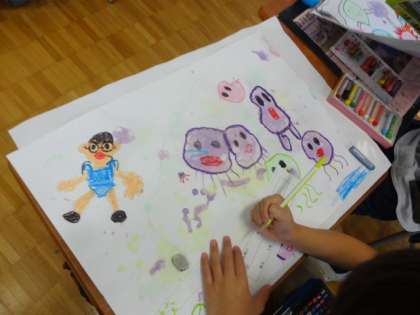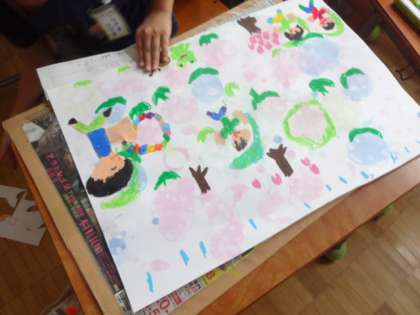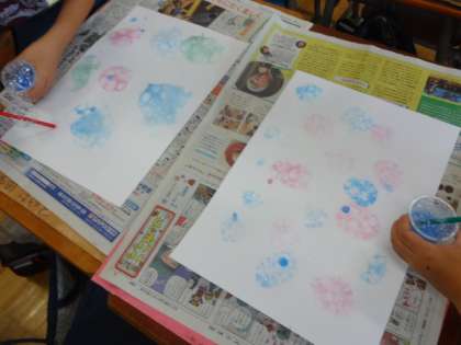 絵の具とせっけん水で泡を作り、絵をかきました。できた泡の様子から、見える形を考えて絵を付け足しました。泡を作ったり、絵をかいたりすることを楽しみました。
