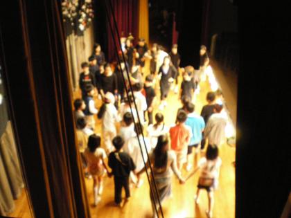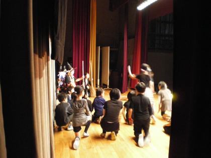 リハーサルの舞台裏の様子です。時間も10分近く短縮し、自信を持って本番に挑みます。声の大きさ、振り付け、動きなどみんなで確認しました。