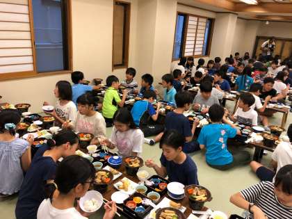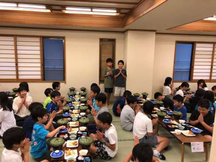 食堂に入るなり、ごちそうを見て「すごい!」「おいしそう」とつぶやく子どもたち。