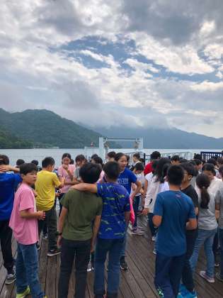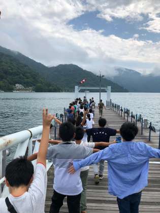 先ほどまでの雨はどこやら。これから遊覧船に乗ります。両手を広げ、今にも飛び立ちそうな人もいます。