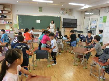 2学期が始まってどのクラスも席替えをします。「前の方かな?」「誰が隣かな?」などドキドキしながら先生からの発表を待ちます。席が決まるとみんな笑顔で机を動かします。多くの友だちと関わって友だちの輪を広げてもらいたいと思います。隣の席になった友だちと協力して日直当番をやります。今日から新しい席での学習が始まります。