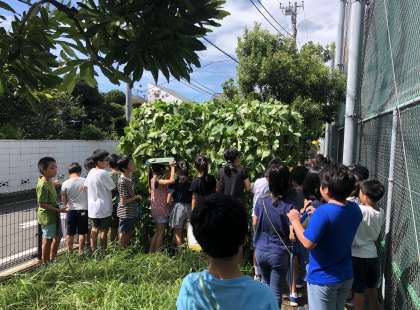 夏休みをはさみ、大きく育った葉や花、実を見つけて「大きい」や「ザラザラしている」など見たり、触ったりしながら観察しました。