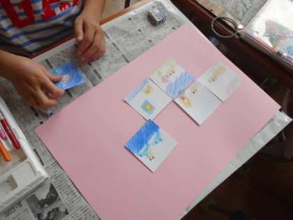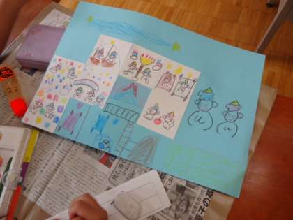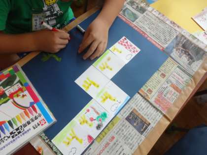 主人公は誰にしようかな。1つかいたらまた1つ、お話がどんどんつながります。紙のつなぎ方を考えて、お話をかくことを楽しみました。