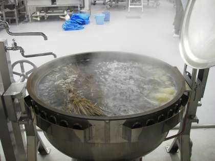 給食室の釜が煮えたぎっています。沸騰しているお湯のなかにワラが入っています。