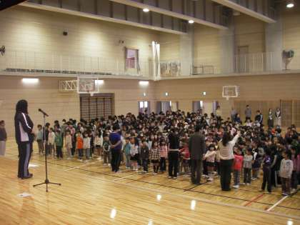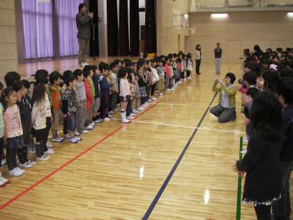 今日の全校朝会から1年生が参加しました。前に並び挨拶をしてから仲間入りです。 今日は東日本大震災から1か月です。内閣総理大臣 管直人、文部科学大臣 高木義明連名の子どもたちに向けたメッセージが読まれました。