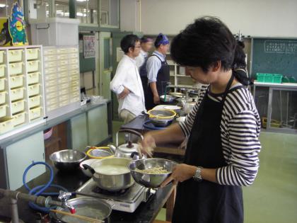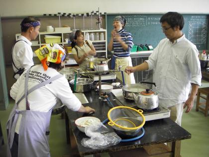 作ったうどんは、理科室でゆでます。お父さんも協力してくれています。一家そろって全員で参加してくだっさった方もいます。嬉しいことです。
