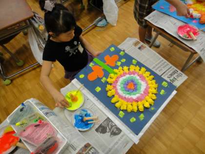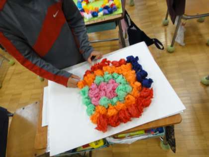 「みらいの花」を想像してつくりました。お花紙を丸め、画用紙に貼り付けました。色や形を工夫して、一人一人素敵な花が咲きました。スタンプを押して完成しました。