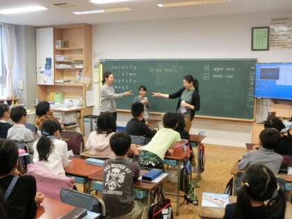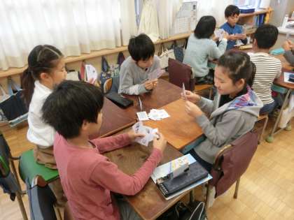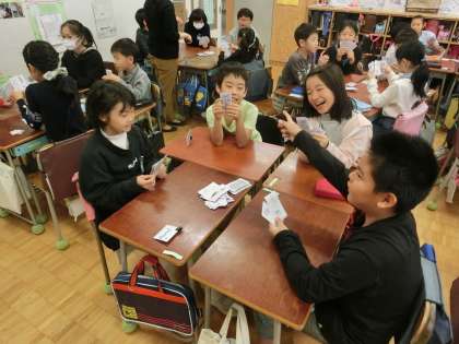 「Do you have 〜」のフレーズを学習しました。同じフレーズの英語を繰り返し話すことで楽しみながらカードゲームを進めました。また、ALTのサンディ先生とも楽しくやりとりしながら授業を進めていました。