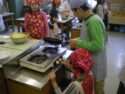 家庭科で「野菜いため」の調理実習がありました。いろいろな野菜を、銀杏切りや短ざく切りで切って、油をひいたフライパンでいためました。日ごろは何気ない野菜いためでも、自分たちで作ったものはとても美味しく、新鮮でした。
