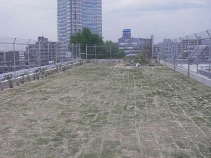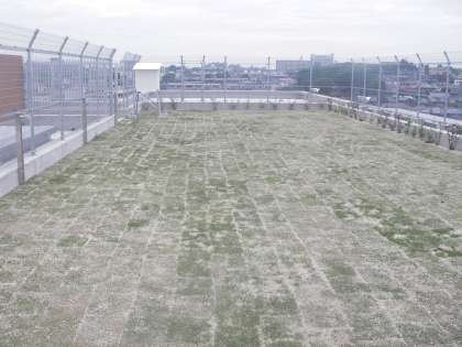 屋上の芝生の現在の様子です。裸足で遊びまわれますよ、との触れ込みで屋上を芝生化しました。五月になりましたがまだ芝生は伸びていません。なかなか難しいものがありそうです。しかし、全面が緑のじゅうたんになったら素敵です。楽しみです。
