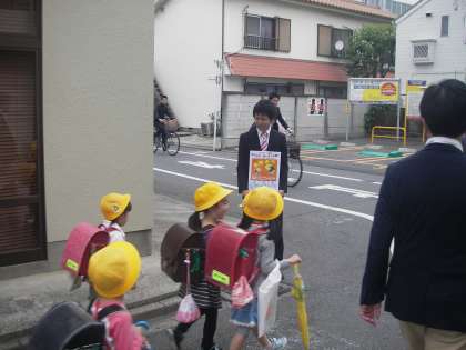 大人がただ立っているだけでは分からないので、柴田先生は、おはコミのポスターを持ってあいさつしていました。いいアイディアです。