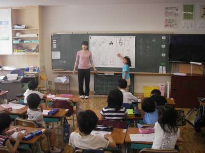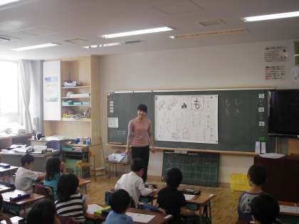 1年1組我妻さとみ学級を参観しました。国語「ひらがな」の授業です。「も」を学習していました。「も」の書き順、形、それぞれの線の位置関係などをたとえのお話などを交え楽しそうに学習しています。子どもたちの態度も落ち着いています。渡辺ふみほ先生も観てくださっています。