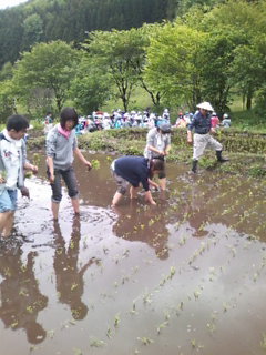 田植えは先生も挑戦です。手慣れたもので手早く植えていきます。農大生もとても上手です。