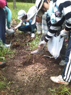 林業体験その2、間伐で切り倒している木は紙の材料になります。山のうえでは植林をしています。コナラの苗木を植えています。京西小の子どもたちのためにいろいろと準備をしてくださいました。感謝です。