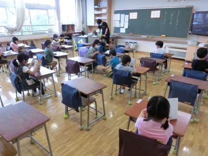 先生の話をよく聞いて学校生活の過ごし方や教室での決まりについて学んでいます。