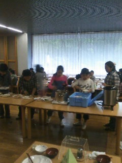 2日目の夕食はハンバーグです。今日は一日動いて活動していたのでみな完食です。写真はお代わりの列です。嬉しいお代わりです