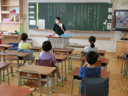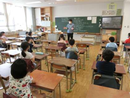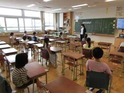分散登校で半分の児童しか登校していませんでしたが、元気な3年生の教室は明るい雰囲気でした。