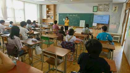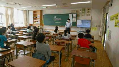 クラスのチームワークを高めるゲームの説明中です。みんな、しっかりと話が聞けています。