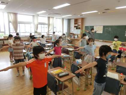 2枚目の写真は、社会科の学習で、東西南北について学習している様子です。体を使って覚える活動では、先生の説明を真剣に聞きながら、楽しく取り組む姿が見られました。