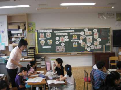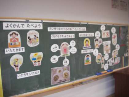 13日2校時、2年生で栄養士の矢後先生が授業をしてくれました。「よくかんでたべよう」です。「いただきます」私たちは、命をいただいて、生きていますから授業はスタートです。今回の授業には月刊誌「学校の食事」が取材に入っています。雑誌に載る予定です。