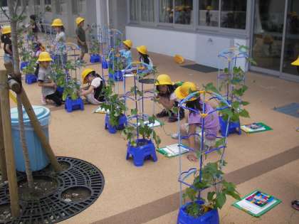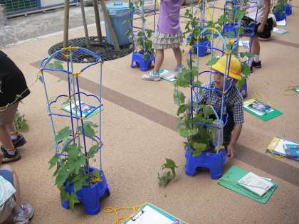 一年生が育てている朝顔がぐんぐんと伸びてきています。つるを伸ばすと、もう子どもたちの身長を越えています。葉っぱもツルもちくちくするーうと言いながら運んでいます。花が咲き始めているのもあります。しっかりと観察しています。