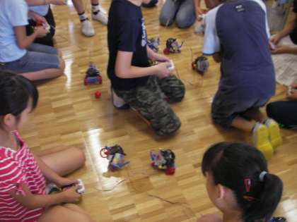 リモコンを持ちロボットを操作します。ボールをけったり、戦ったりしています。みんなが集中しロボットに夢中になっています。
