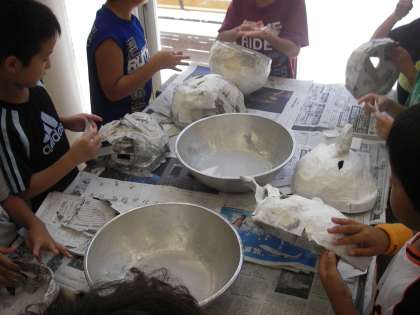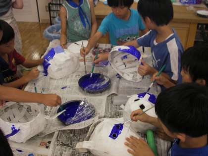 もうお面に色を塗る段階の子どもとあ面作りの子どもに分かれています。どんなお面が出来上がるか楽しみです。