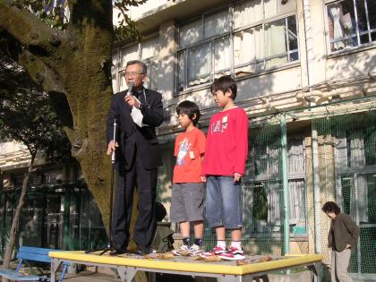 今日は、まずはじめにぺーゴマ大会でブロック優勝したA.B君の紹介です。自分で加工したベーゴマを持ってきてくれました。朝礼台の上でまわしてくれました。ベーゴマに紐を結わくのさえ難しいのです。軽々と回して見せてくれました。