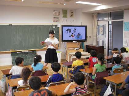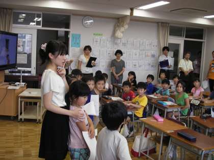 1学期の係の活動を頑張ったことを発表しました。教室の後ろには多くの先生が参観しています。子どもたちは堂々と発表しています。我妻先生も笑顔を絶やさず頑張っていました。子どもとの良い関係ができている雰囲気でした。