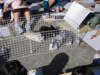 校庭の陽だまりの中、2年生が写生をしていました。何を描いているのかと見ますと、うさぎを描いていました。