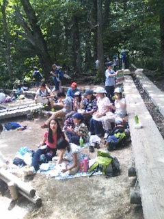 湯滝を見たあとはグループごとのハイキングです。ひとグループが途中で道を間違えましたが、直ぐに気がついて戻りました。森の爽やかな風をうけ、お弁当タイムです。