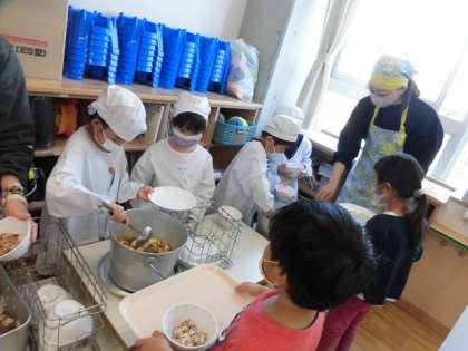 1年生は今日からついに給食当番がスタートしました。こぼさないように、食器を落とさないようにと一生懸命に取り組みました。