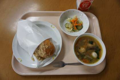 【揚げパン・肉団子入り春雨スープ・野菜のドレッシングがけ・牛乳】です。