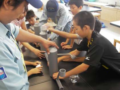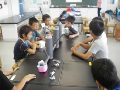 下水道のお話、上学年は、実際に下水道の仕組みを模型で作ります。家庭から出された水等がマンホールのある下水管に流れていきます。それが、最終的に処理施設にまでいく模型です。うまくできています。