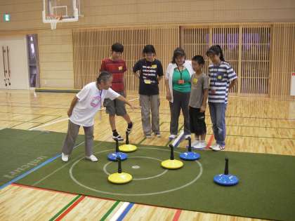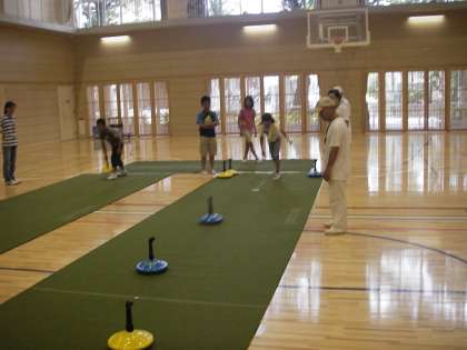 氷の上ではなく普通の体育館の床で出来ます。カーリングがすーっと滑っていく感覚が意外であり楽しいスポーツです。昨年に引き続きての開催でした。大人よりも子どもたちが上手でした。床に落とすポイントがいいのです。