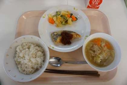 【麦ごはん・野菜スープ・魚のバーベキューソース・マセドアンサラダ・牛乳】です。