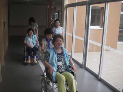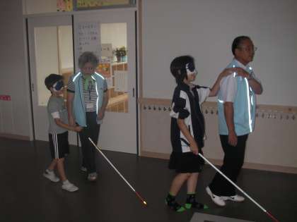 車椅子体験、ブラインドウォーカー体験(視覚障害)、高齢者疑似体験の三つを順番に体験しました。人をおもいやる気持ちが芽生えてくれるといいなあと思います。