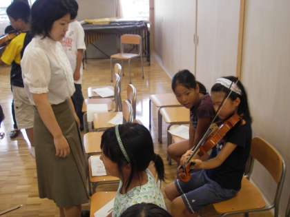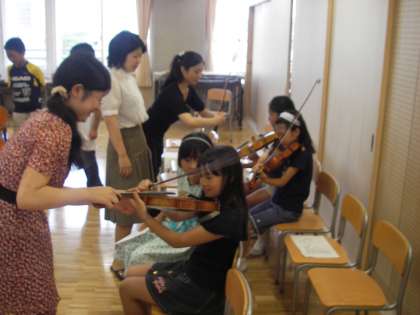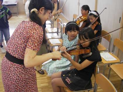 夏ミニコンサートの演奏が終わると、質問コーナー、楽器体験です。まずは副校長先生がバイオリンに挑戦です。子どもたちも次第に慣れてきて、バイオリン、ビオラ、チェロに挑戦していました。6年生から見ると7年先の先輩の姿です。