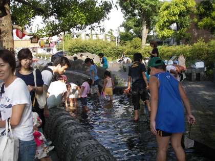 昨日から今日に延期になった「納涼の夕べ」が快晴のもと開かれました。3時からは「どじょうつかみ」です。子どもたちはずぶぬれになりながらドジョウを追いかけています。袋の中をよく見てください。たくさんのドジョウがいます。
