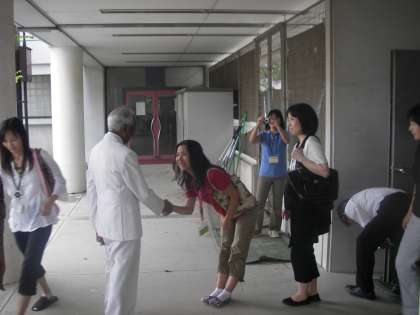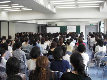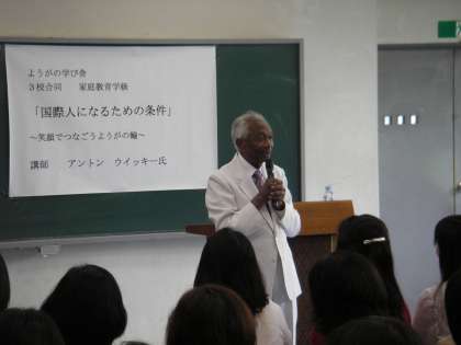 「国際人になるための条件」という演題でのお話です。自分の体験を土台にしたユーモアあふれるお話でした。スリランカ出身だそうです。日本に国費留学生としてきたということでした。小さい頃に外国語にふれる機会を持たせるといいですよ、というお話もありました。会場は満員状態です。200人も参加してくれました。最後はウィッキーさんは一人ひとり参加者と握手をして講座が終了となりました。