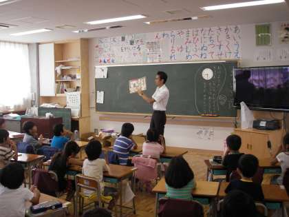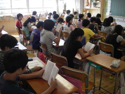 水曜日は「朝読書」です。2学期初めての水曜日です。1年生から6年生までの教室をまわってみますと、まだ片づけをやっているクラスもありましたが、各学年とも熱心に本に向き合っています。1年生は先生が読み聞かせをしていました。